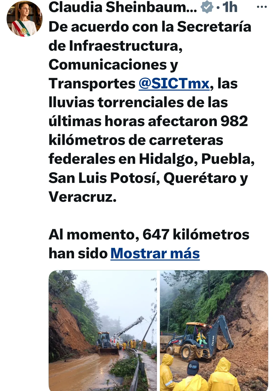 La presidenta de la República, Claudia Sheinbaum, reportó con base en la información de la Secretaría de Infraestructura, Comunicaciones y Transportes que las lluvias torrenciales de las últimas horas afectaron 982 kilómetros de carreteras federales en Hidalgo, Puebla, San Luis Potosí, Querétaro y Veracruz.