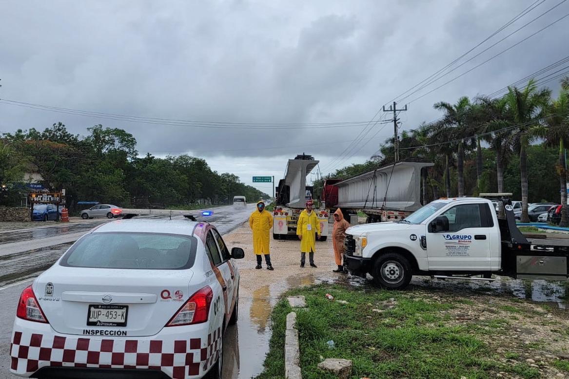 En Playa del Carmen, se desplegaron tres patrullas, tres inspectores y hasta el momento se hizo el rescate de un vehículo, mientras que las zonas con mayores encharcamientos son Villas del Sol y la Colosio.