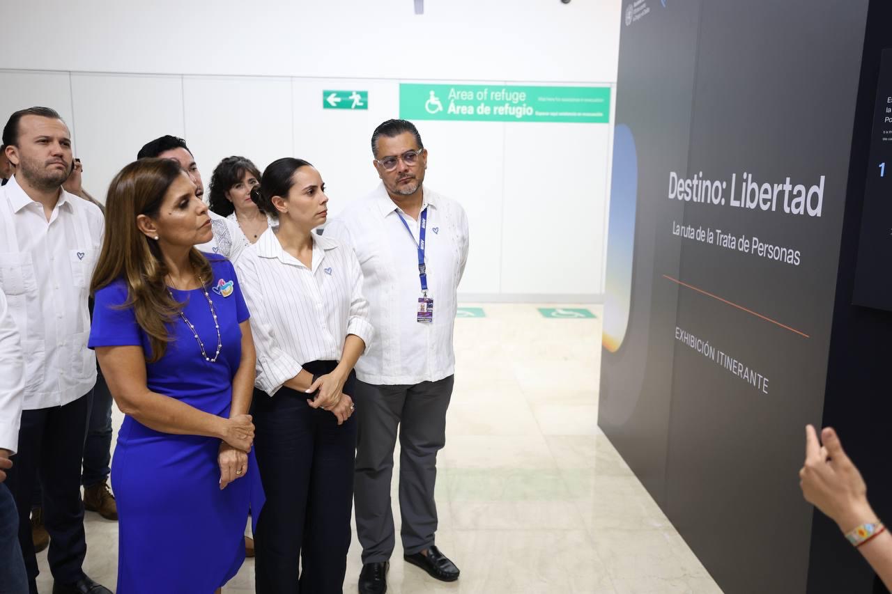 Cancún, Q. R., a 10 de abril de 2025.- En el marco de la inauguración de la exposición itinerante “Destino: Libertad. La ruta de la trata de personas” en la Terminal 4 del Aeropuerto Internacional de Cancún, la Presidenta Municipal, Ana Paty Peralta, reafirmó el compromiso de su gobierno en combatir frontalmente el delito de trata de personas y posicionar a Cancún como un destino seguro y libre de explotación humana.