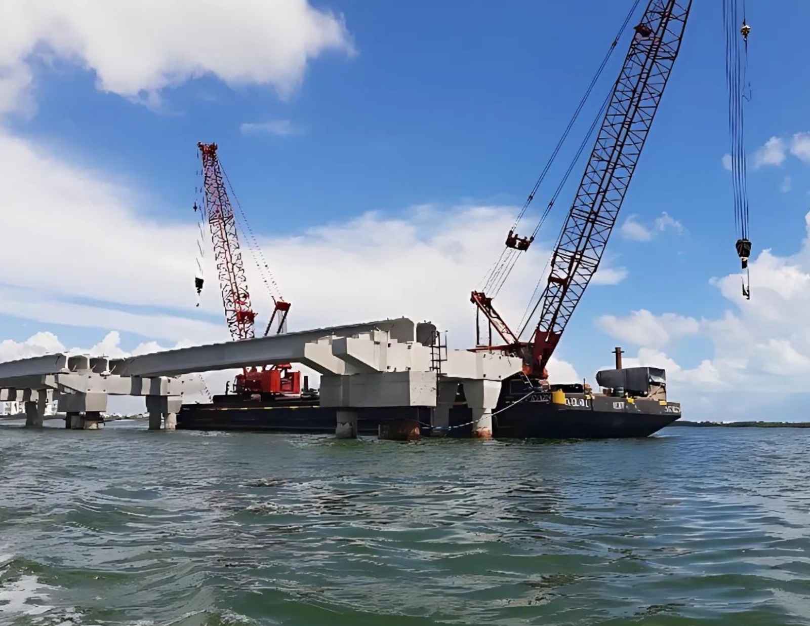 El puente vehicular avanza en su etapa de construcción a través del sistema de barcazas en la zona lagunar, mientras se finalizan las labores para liberar el entronque del distribuidor vial Kabah-Colosio-Bonampak-Tulum.