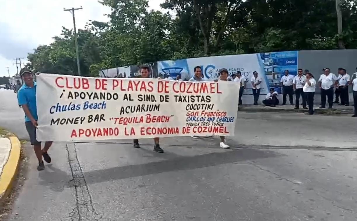 Los inconformes se congregaron sobre el bulevar Aeropuerto con 65 avenida, donde colocaron algunas barreras y mantas para impedir el paso de vehículos que prestan el servicio de transporte del aeropuerto hacia los diversos hoteles de la isla.