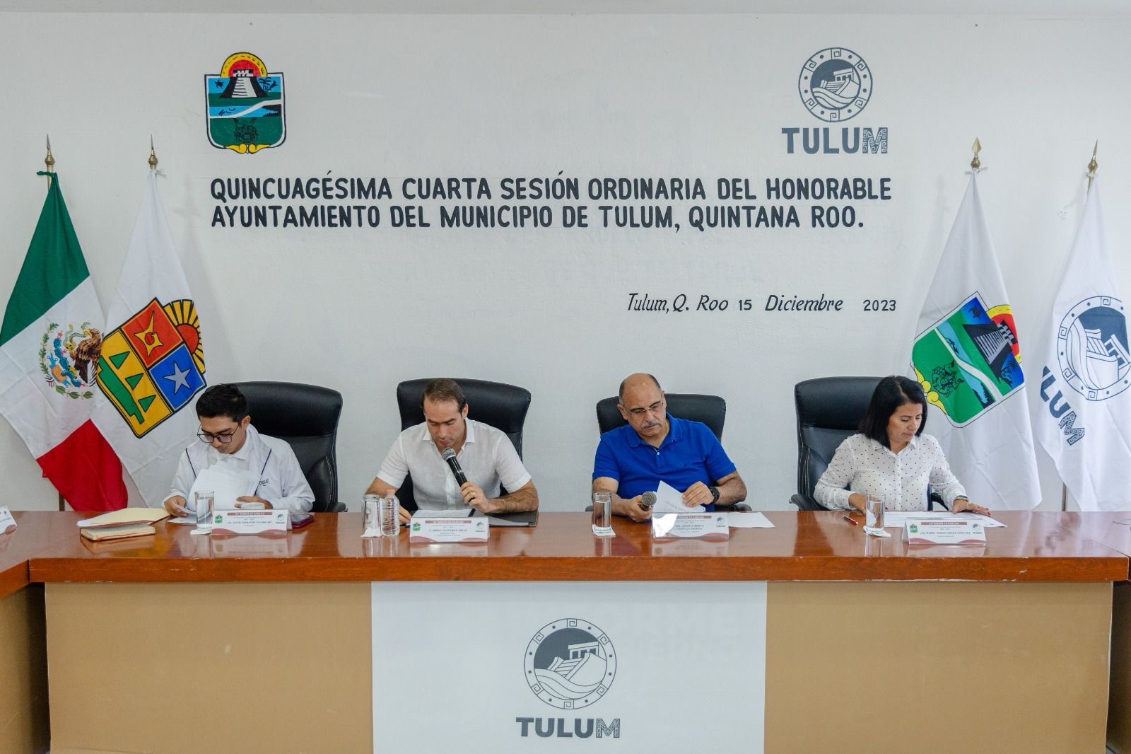 Tulum, 15 de diciembre del 2023.- En la Quincuagésima Cuarta Sesión Ordinaria del Ayuntamiento de Tulum, la síndico y regidores encabezados por el Presidente Municipal, Diego Castañón Trejo aprobaron por unanimidad el programa de estímulos fiscales al Impuesto Predial y al pago de derecho por concepto de recolección, traslado, tratamiento y disposición final de residuos sólidos para el ejercicio fiscal 2024, los cuales regirán con un 30, 15 y 10 por ciento a los contribuyentes.