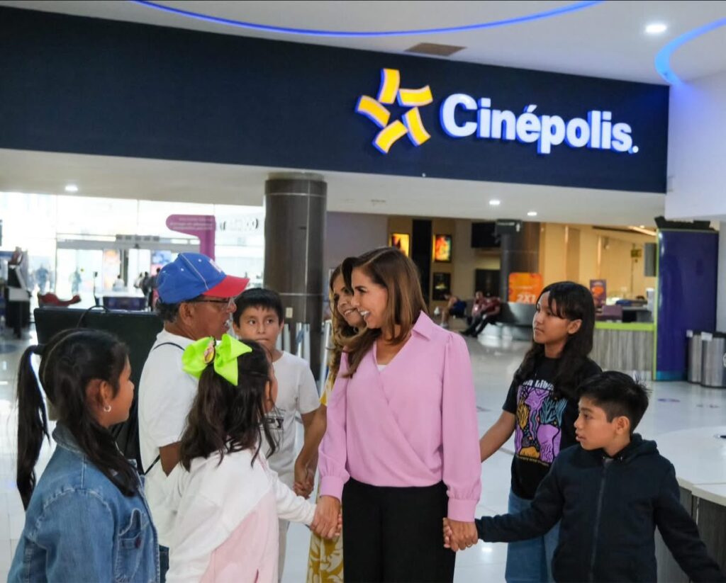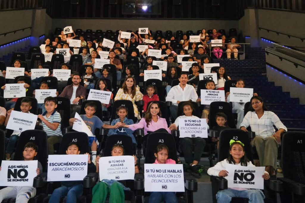 Cancún, 17 de julio 2025/ La titular del Ejecutivo estatal, acompañada por la presidenta del Sistema DIF-Quintana Roo, Verónica Lezama Espinosa, de alumnas y alumnos de Pilares-DIF de Villas Otoch Paraíso, quienes asistieron al Cinépolis de la plaza comercial Las Américas gracias al apoyo de ADO, dijo que a partir de esta semana la campaña “L@s niñ@s no se rompen”, se estará proyectando en 127 salas de todo el estado.