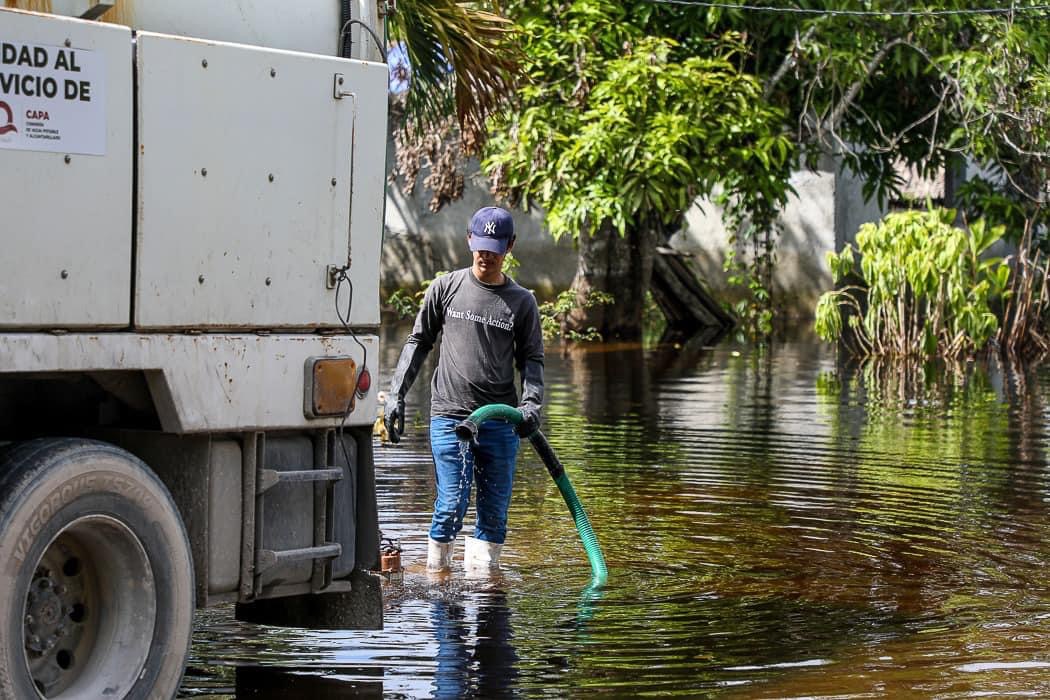 En Bacalar, la CAPA continua con acciones de apoyo para el desazolve de agua pluvial estancada luego de las lluvias y efectos del huracán Beryl en la cabecera municipal.