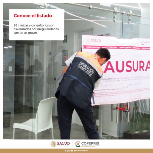 Ciudad de México, 10 de octubre de 2023.- La Comisión Federal para la Protección contra Riesgos Sanitarios (Cofepris) da a conocer la Lista de establecimientos clausurados por incurrir en irregularidades graves en su operación.