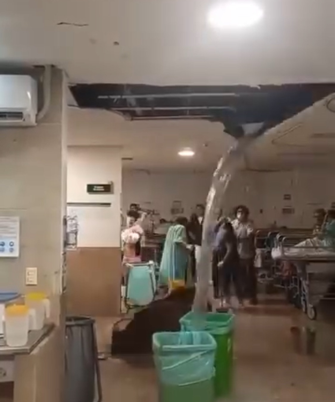 Mediante un video que fue grabado por una de las personas que se encontraba en el lugar y que circula en redes sociales, se observa el momento exacto en que gran parte del falso techo del área de urgencias cede por el peso del agua, cayendo en medio de la sala, cerca de la cama de algunos pacientes, donde también se encontraba personal del nosocomio.