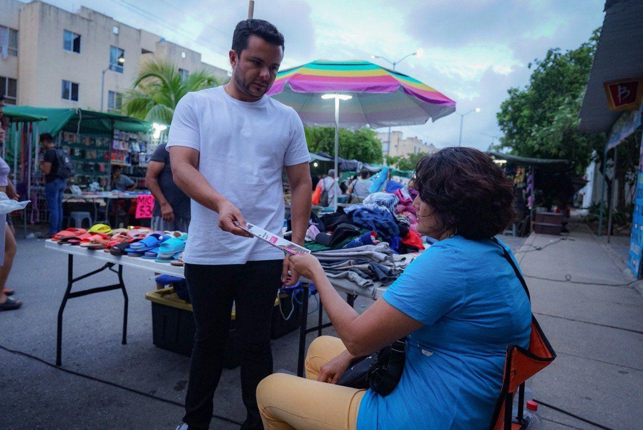 Visita Pablo Bustamante, el tianguis de Paseos del Mar en Cancún, donde habla e invita a la gente sumarse a los programas sociales que impulsa el gobierno humanista de la Gobernadora Mara Lezama, que están transformando miles de vidas