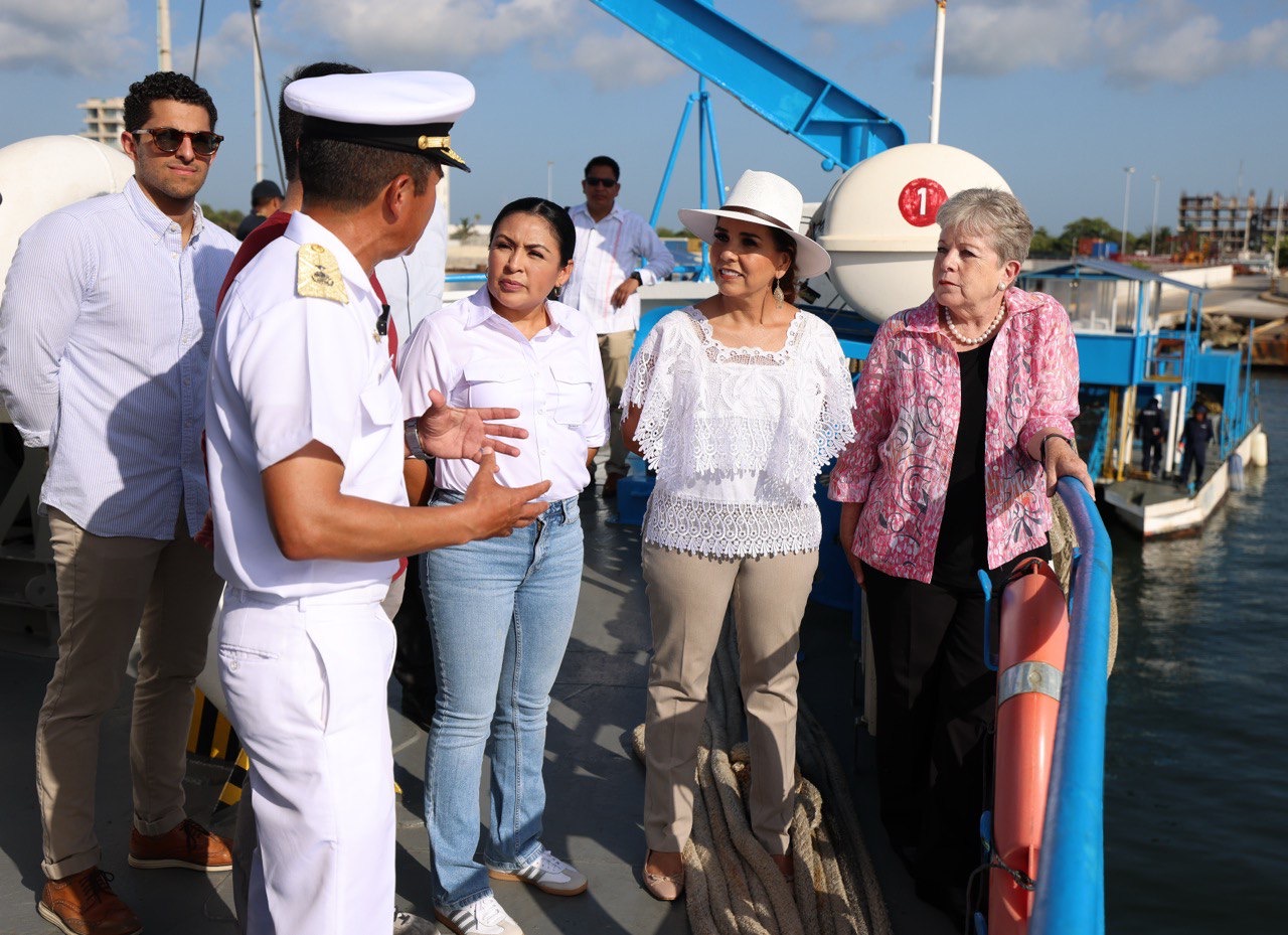 La presidenta municipal de Puerto Morelos acompañó a la gobernadora Mara Lezama y a la titular de la Semarnat, Alicia Bárcena a bordo del buque sargacero y agradeció el apoyo y coordinación de las instancias federales y estatales para aminorar el impacto del arribo de la macroalga a las costas del municipio