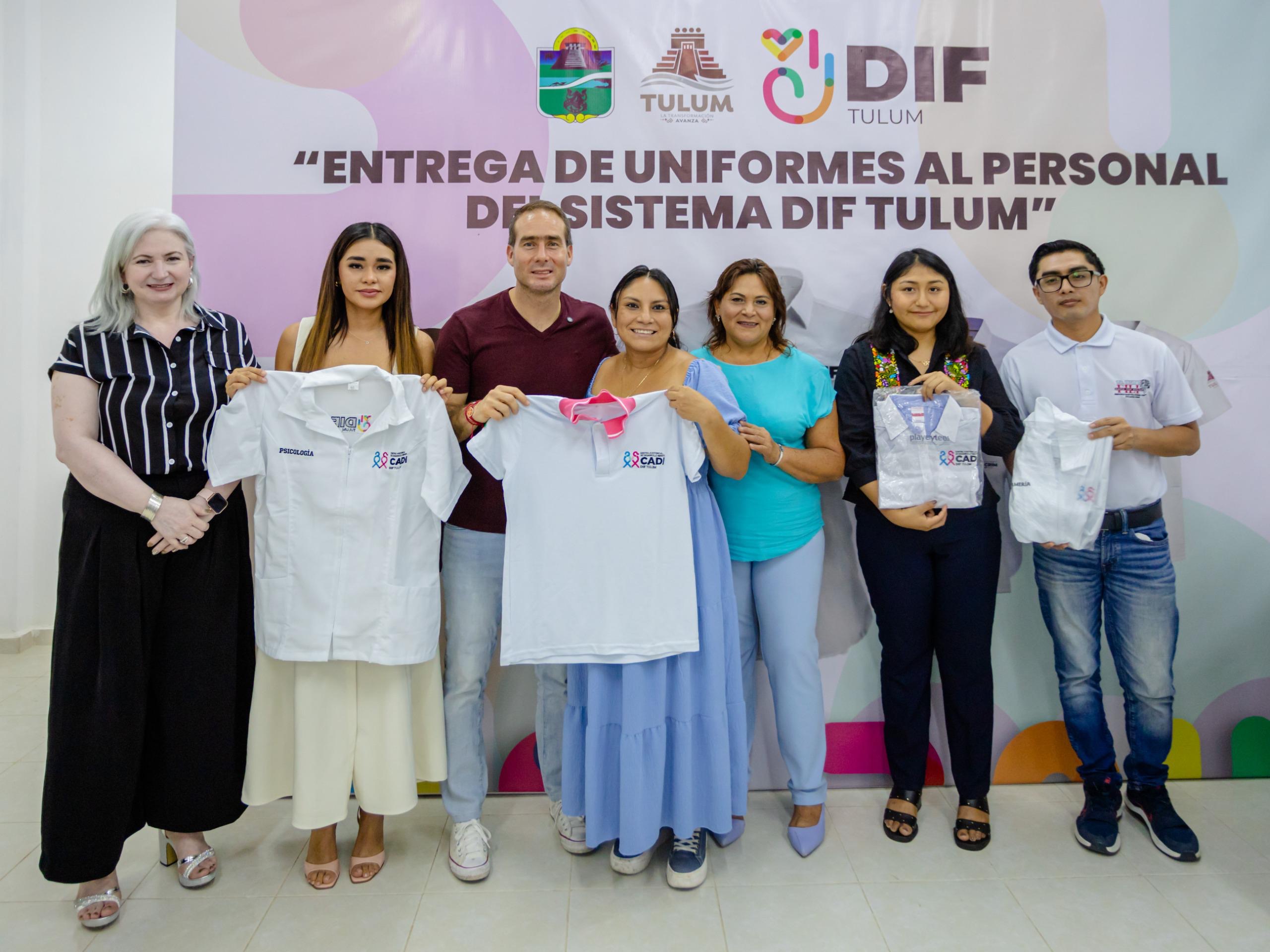 Tulum, Quintana Roo a 01 de agosto del 2025. Trabajadores del Sistema para el Desarrollo Integral de la Familia de Tulum (DIF), recibieron del presidente municipal, Diego Castañón Trejo, 280 uniformes.