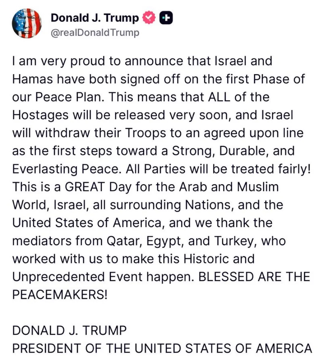 “Me enorgullece anunciar que Israel y Hamás han firmado la primera fase de nuestro Plan de Paz. Esto significa que todos los rehenes serán liberados muy pronto e Israel retirará sus tropas a una línea acordada como primer paso hacia una paz sólida y duradera. ¡Todas las partes recibirán un trato justo! Este es un GRAN día para el mundo árabe y musulmán, Israel, todas las naciones vecinas y los Estados Unidos de América, y agradecemos a los mediadores de Qatar, Egipto y Turquía, quienes trabajaron con nosotros para hacer realidad este acontecimiento histórico y sin precedentes. ¡BENDITOS LOS CONSTRUCTORES DE PAZ!”
