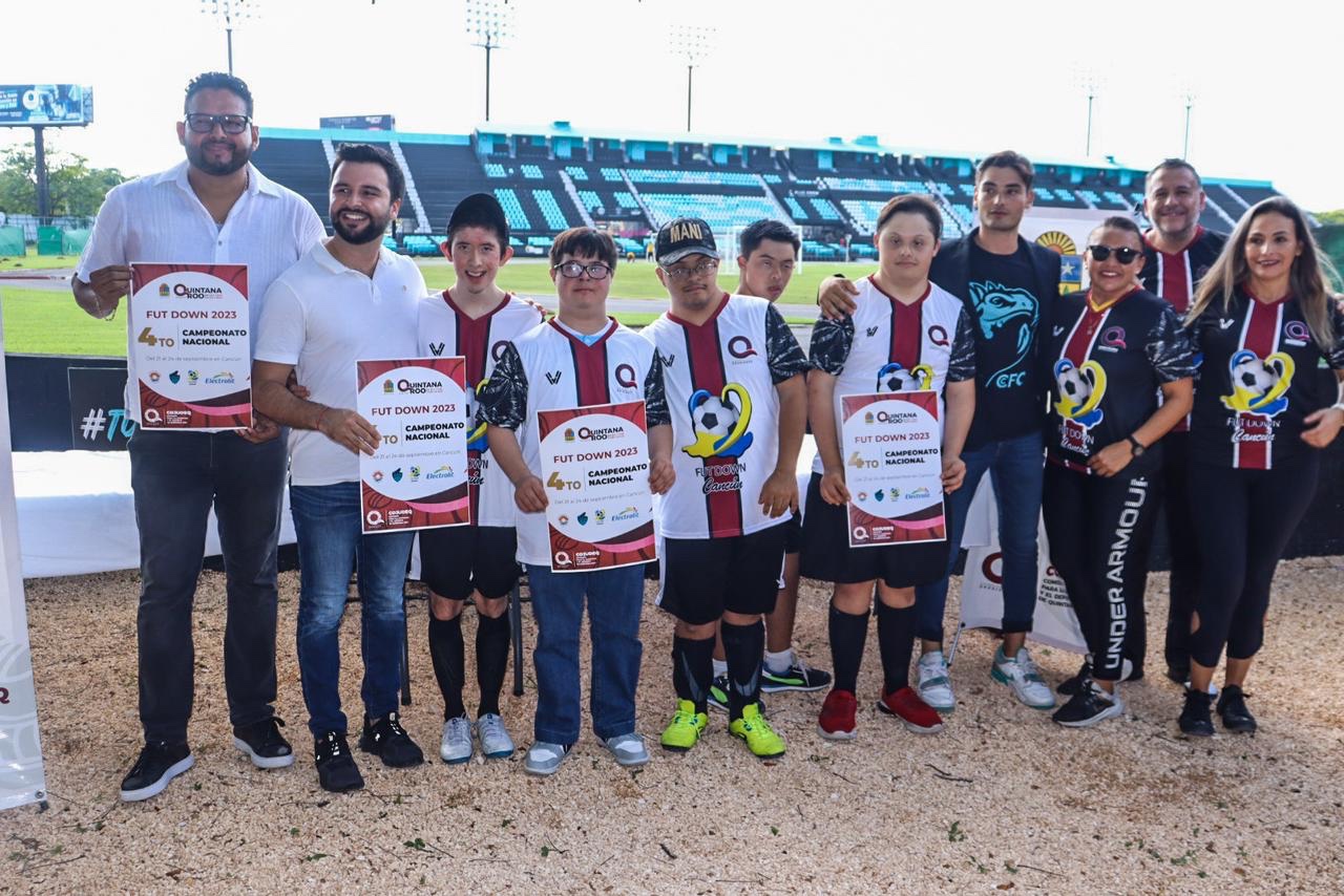 4 de septiembre.- Cancún.- Esperando una participación de alrededor de 15 equipos de todo el país, siendo alrededor de 180 jugadores con síndrome de down, se realizará en Cancún la cuarta edición del “Campeonato Nacional Fut Down 2023”, a disputarse el del 21 al 24 de septiembre próximos, anunció en conferencia de prensa Eric Arcila Arjona, presidente de la Comisión para la Juventud y el Deporte de Quintana Roo (COJUDEQ).