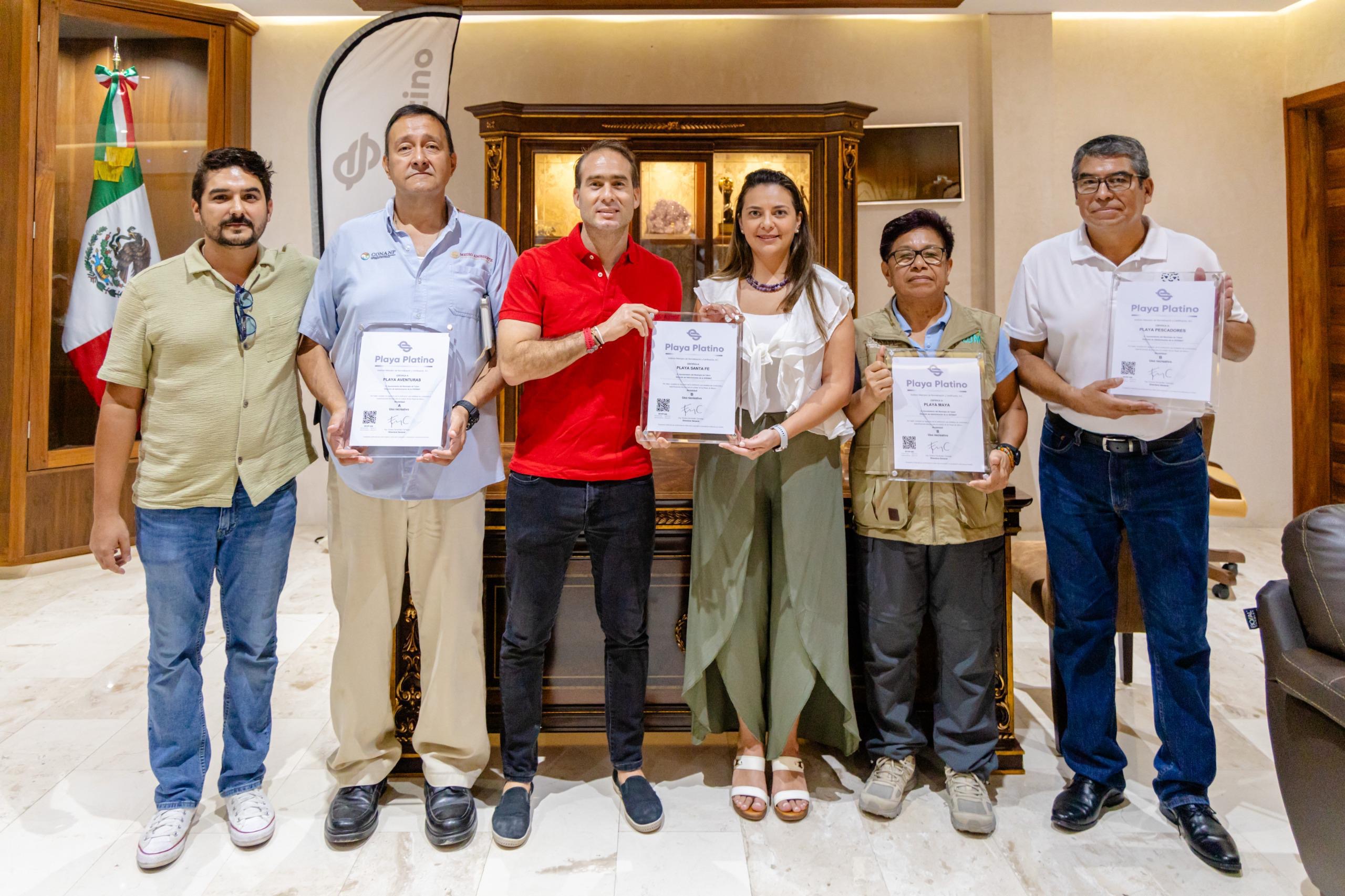 Tulum, 22 de noviembre del 2024.- El Presidente Municipal, Diego Castañón Trejo, recibió este jueves, cuatro certificaciones de playas platino. La entrega formal fue a cargo de Viviana Fernanda Camargo, directora general del Instituto Mexicano de Normalización y Certificación (IMEEC).