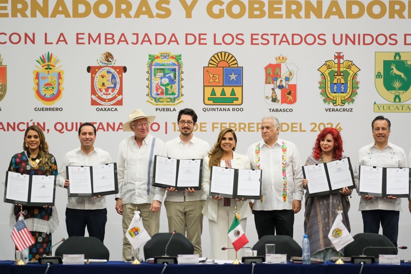Cancún.- Las Gobernadoras y Gobernadores del Sur-Sureste de México y la Embajada de Estados Unidos firmaron el Memorándum de Entendimiento para impulsar el crecimiento equitativo e inclusivo de la región, además avanzan en el trabajo de temas prioritarios como la seguridad, economía, medio ambiente y educación.