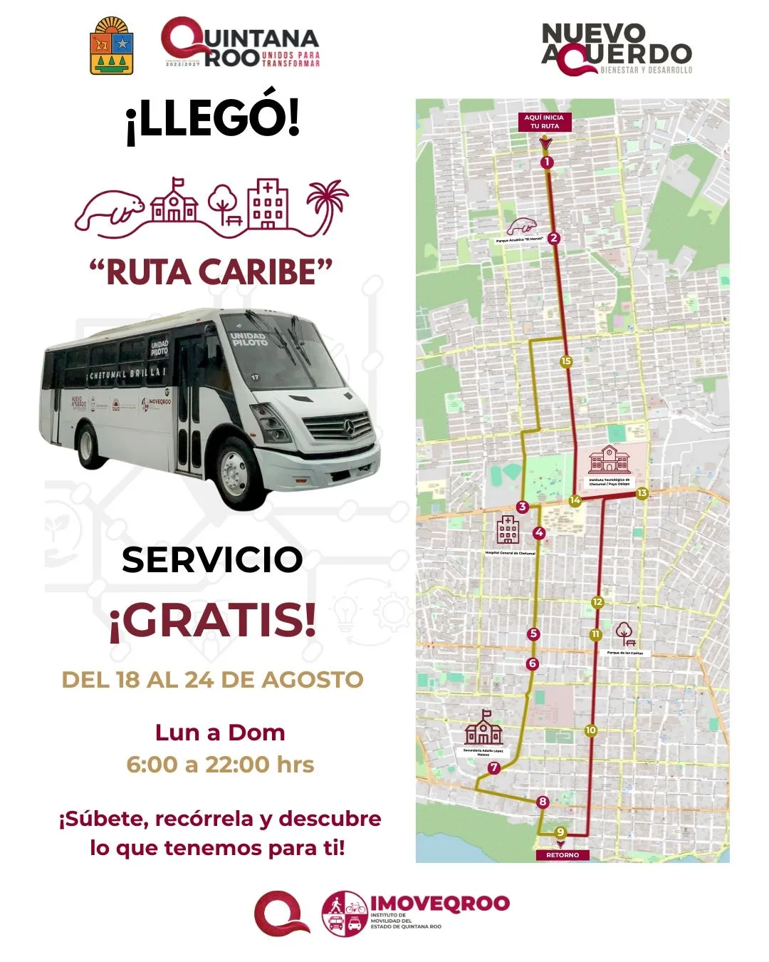 La «Ruta Caribe» comenzará operaciones este lunes 18 de agosto, conectando puntos estratégicos como la escuela primaria «Centenario de la Revolución»; el Parque Acuático El Manatí; el Gimnasio Nohoch Suku’n; el Hospital General; la Clínica Carranza; la secundaria «Adolfo López Mateos»; el DIF Municipal O.P.B; la 34 Zona Militar; Sam’s Club; los Servicios Estatales de Salud (SESA); el Parque de las Casitas; el Estadio 10 de Abril; la Estación de Bomberos; el Instituto Tecnológico de Chetumal; Zoológico Payo Obispo y la escuela secundaria «Armando Escobar Nava».