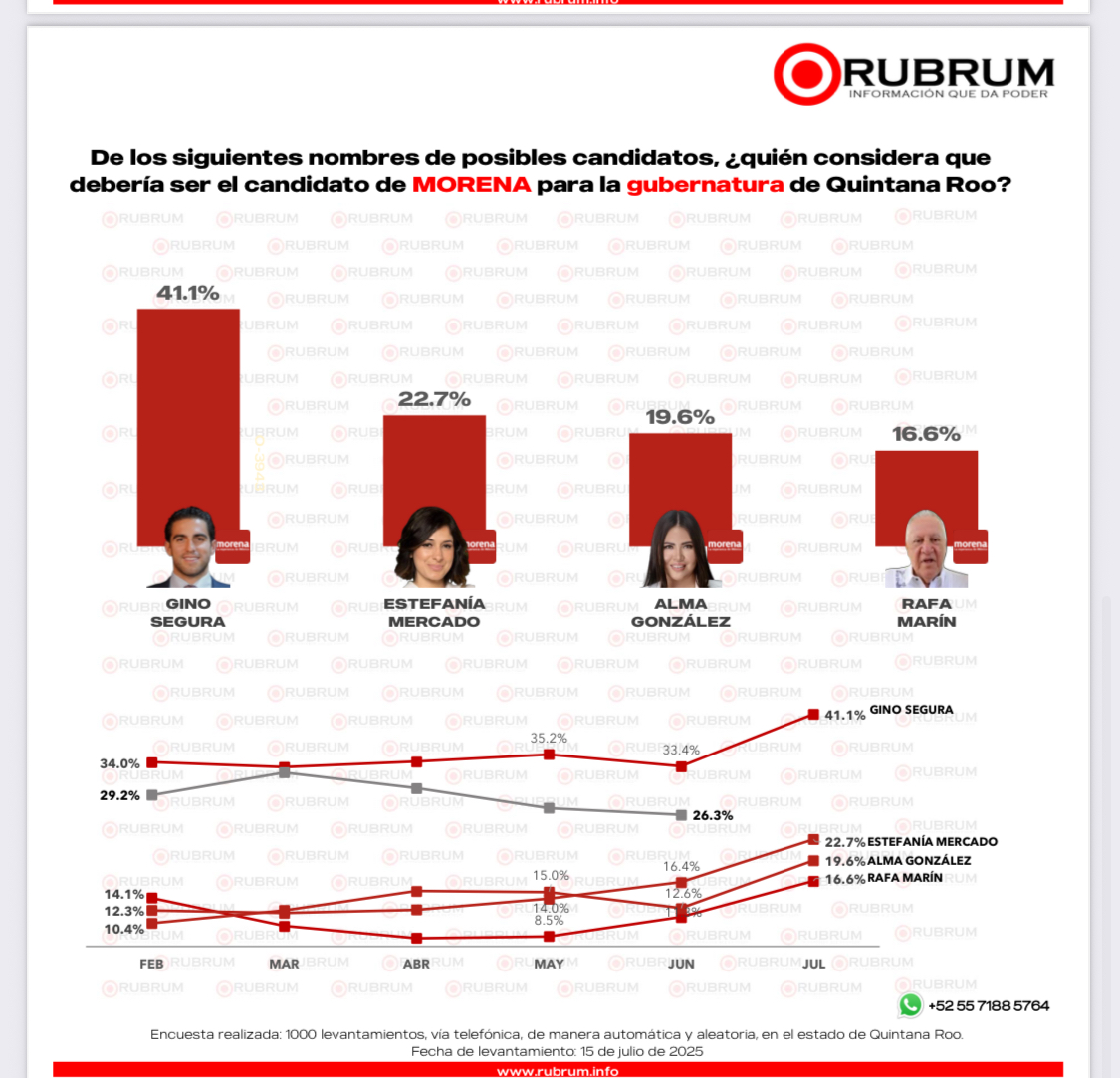 Playa del Carmen, Quintana Roo, 16 de julio de 2025 — El senador Gino Segura lidera las preferencias internas para encabezar la candidatura de Morena a la gubernatura de Quintana Roo en 2027, según revela la más reciente encuesta de la casa encuestadora Rubrum, publicada este 16 de julio.