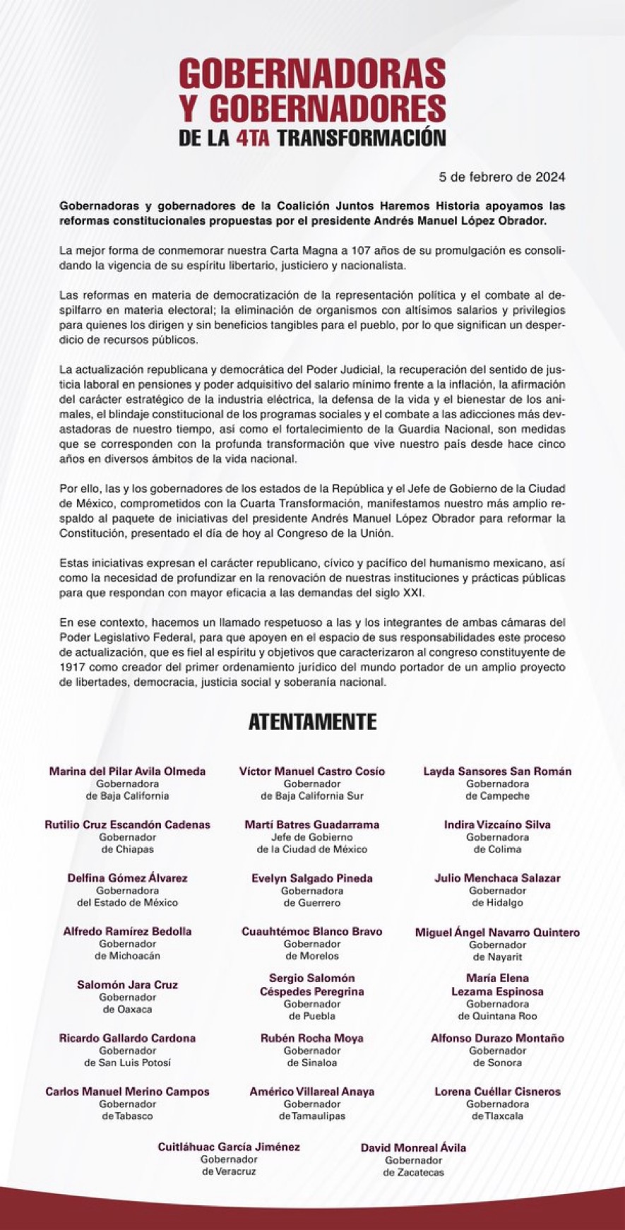 Los gobernadores pertenecientes a Morena mostraron su respaldo al paquete de reformas presentado por el presidente Andrés Manuel López Obrador.