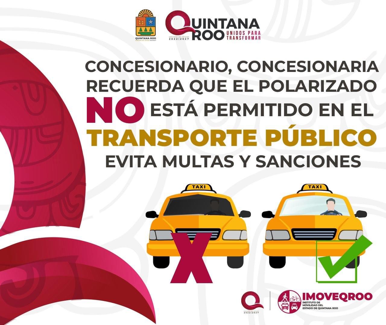 Chetumal. – Con la finalidad de garantizar la seguridad de las y los usuarios del sistema de transporte público, el Instituto de Movilidad del Estado de Quintana Roo (IMOVEQROO) lanza campaña para el retiro de polarizados en las unidades de transporte público de concesión estatal, tanto taxis como colectivos.