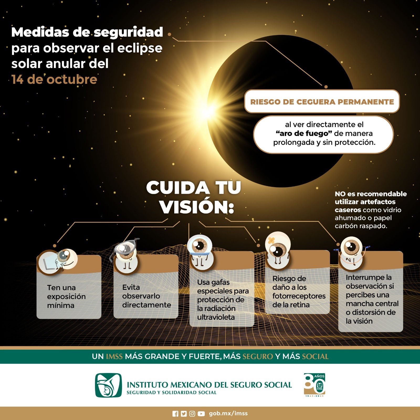 Con motivo del eclipse solar anular de este sábado 14 de octubre, el Instituto Mexicano del Seguro Social (IMSS) recomienda a las personas que deseen apreciar este fenómeno astronómico cuidar de su vista al evitar observarlo directamente, usar gafas especiales durante el momento en que ocurra o cuando haya concluido, y sin tener exposiciones prolongadas que puedan afectar la visión.