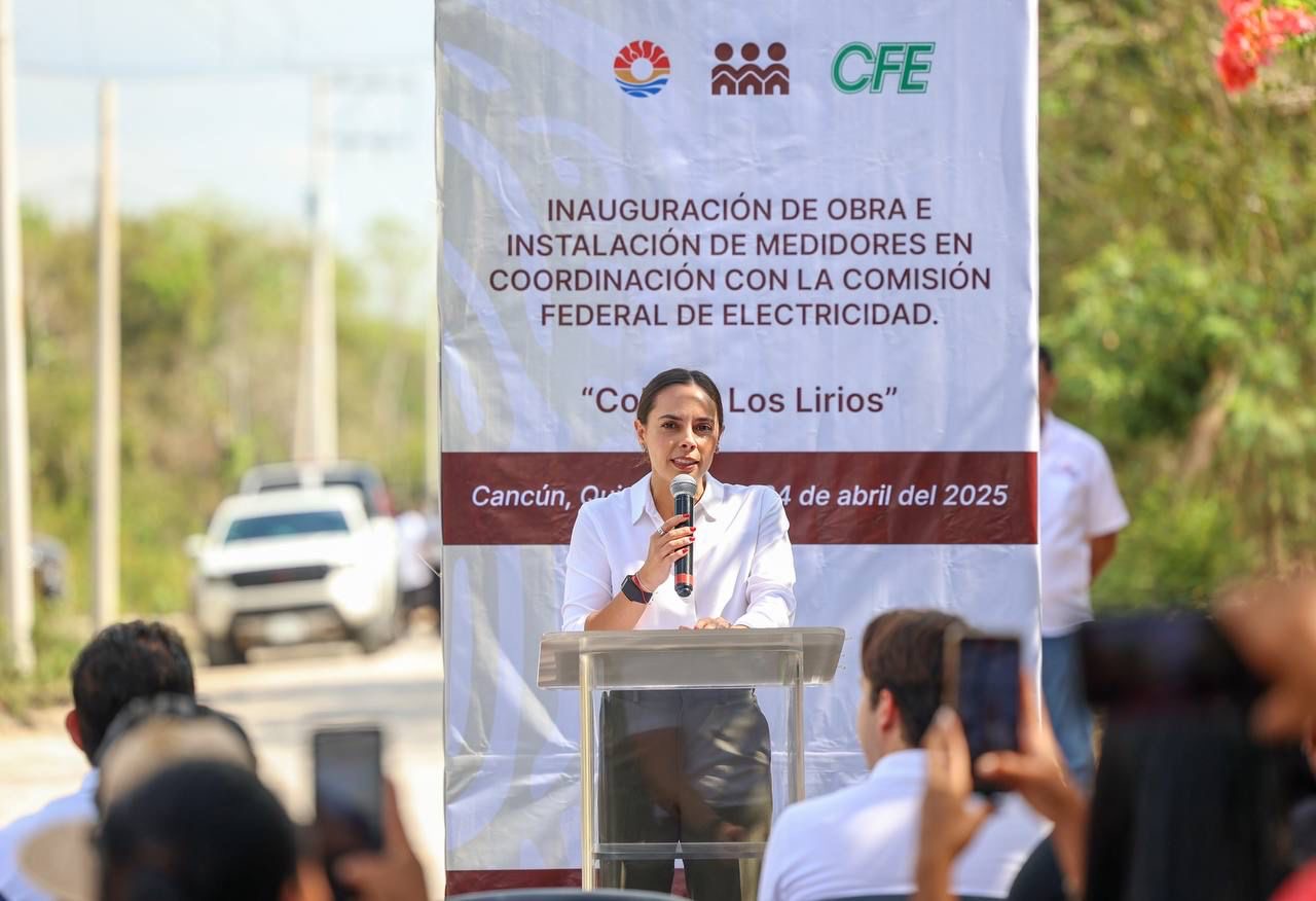 Cancún, Q.R., a 03 de mayo de 2025.- Después de 25 años de no tener luz en la colonia “Los Lirios”, la Presidenta Municipal, Ana Paty Peralta, inauguró la obra de instalación de 56 medidores, en coordinación con la Comisión Federal de Electricidad (CFE), el Instituto de Regularización para el Bienestar Patrimonial y los Comités de Electrificación, además de efectuar un recorrido de supervisión por la zona.