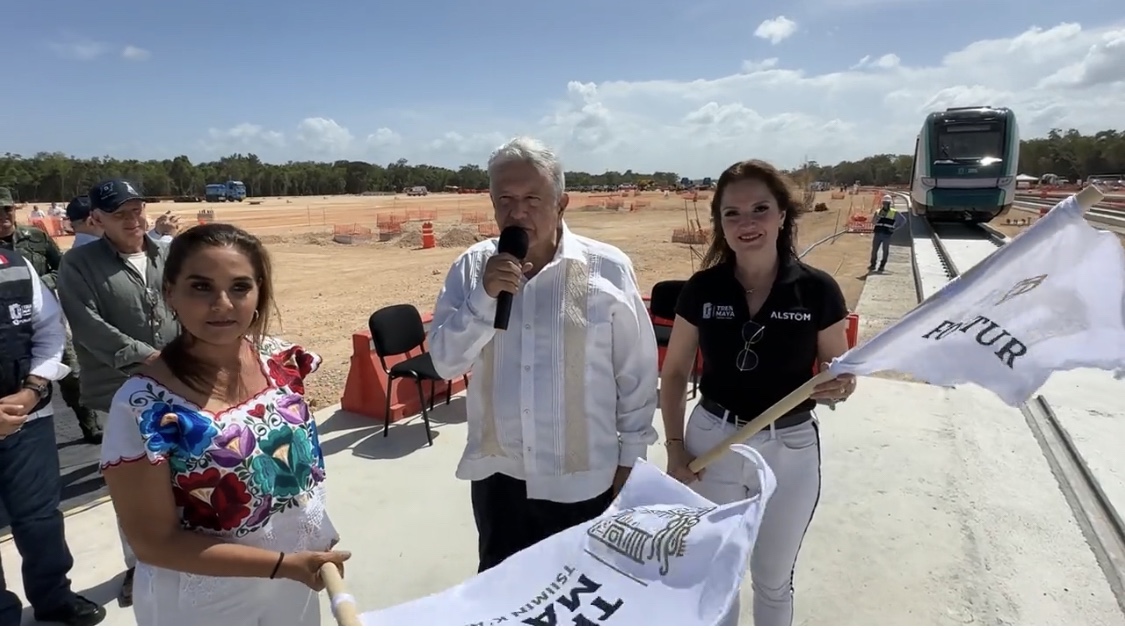 ZC/ Acompañado de la gobernadora Mara Lezama y de la representante de la empresa responsable de la construcción del tren, López Obrador inauguró este sábado el primer vagón que llegó a Cancún.