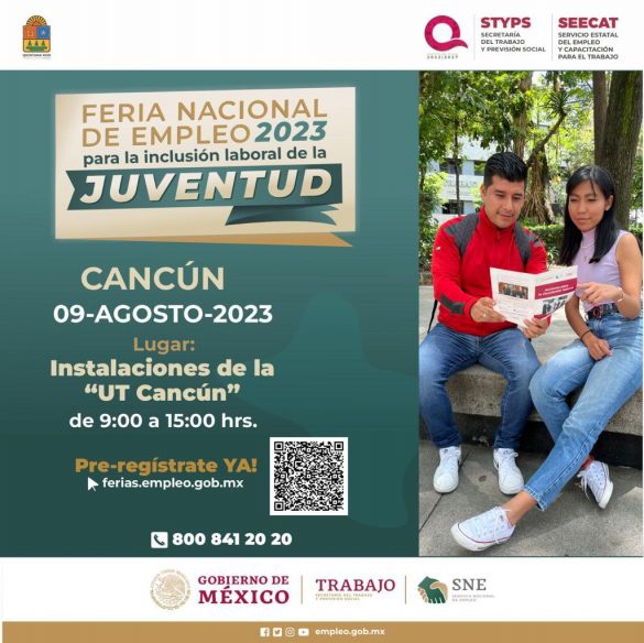 1 agosto.- Chetumal.- Con el objetivo de apoyar a las y los jóvenes a tener mejores oportunidades laborales, la Secretaría del Trabajo y Previsión Social del Estado (STyPS) y el Servicio Estatal de Empleo y Capacitación para el Trabajo (SEECAT) ofertarán más de 2 mil 500 vacantes de 50 empresas, en la Feria Nacional de Empleo 2023, que se llevará a cabo en los municipios de Benito Juárez, Othón P. Blanco y Solidaridad durante este mes.