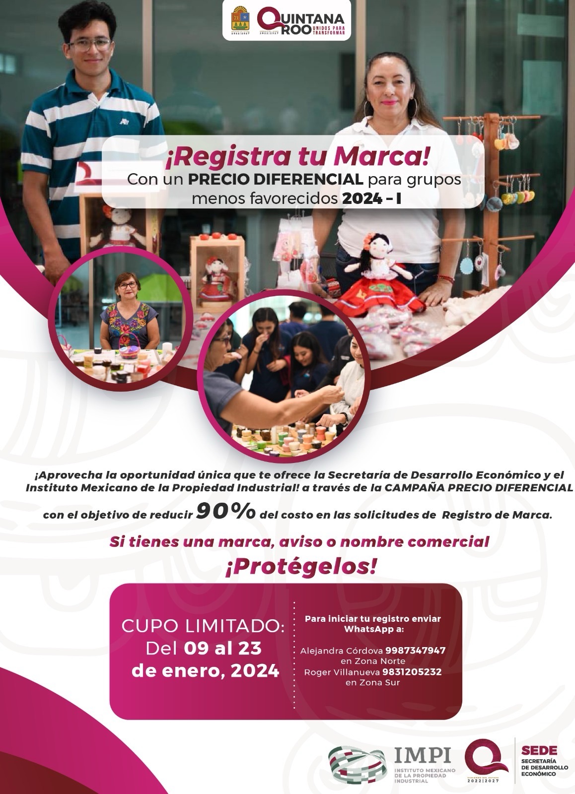 Chetumal.- Con el objetivo de impulsar a las empresas y emprendedoras y emprendedores de Quintana Roo y que cuenten con registro de marca de sus productos, la Secretaría de Desarrollo Económico (SEDE) en coordinación con el Instituto Mexicano de la Propiedad Industrial (IMPI) ponen en marcha el «Programa de Precio Diferencial para Grupos Menos Favorecidos 2024-I».