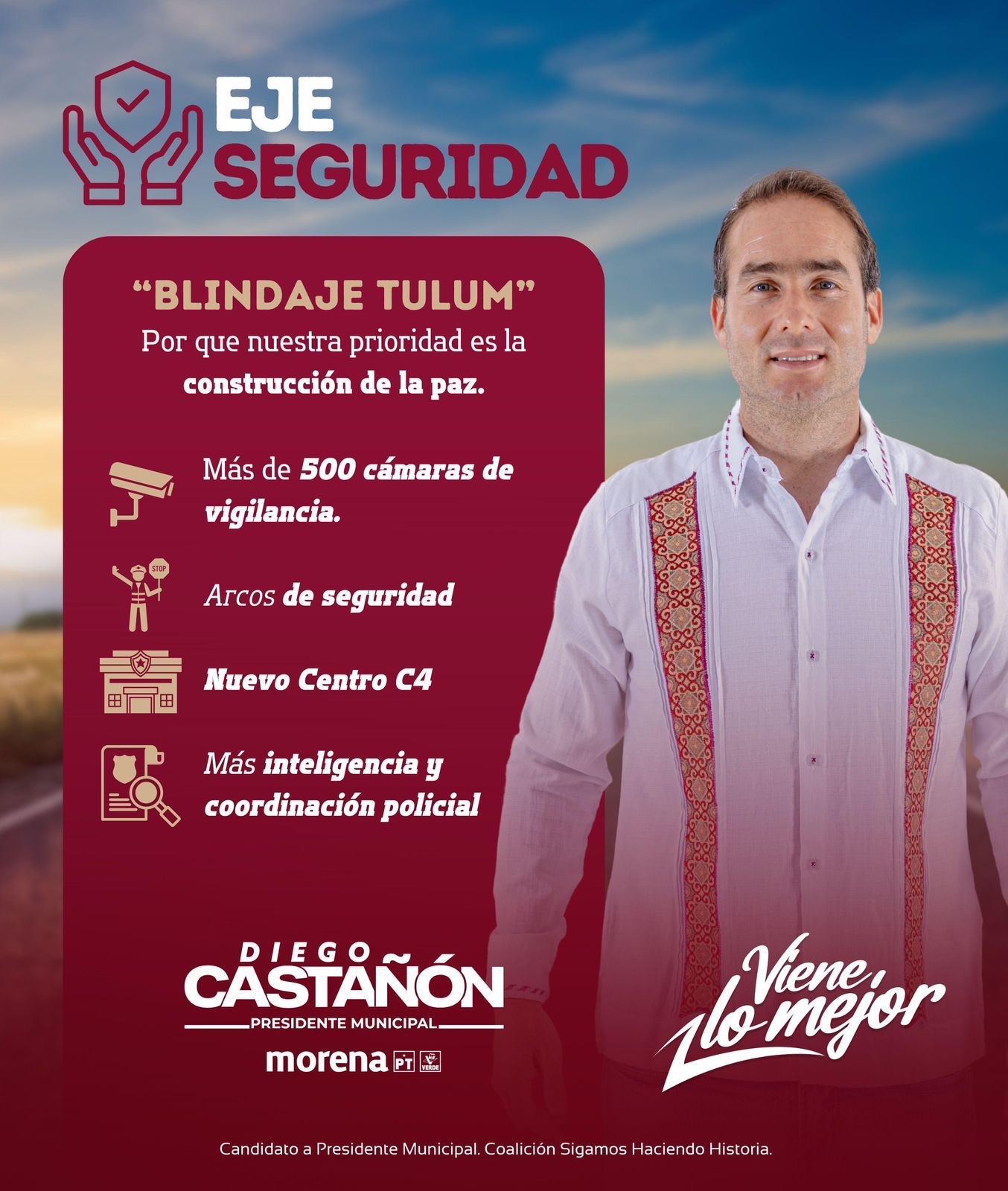 Resaltó que la Seguridad, el tercer eje de su propuesta de gobierno, es parte primordial. En ese sentido, su propuesta «Blindaje Tulum» considera la instalación de más de 500 cámaras de seguridad y arcos de seguridad en puntos estratégicos.