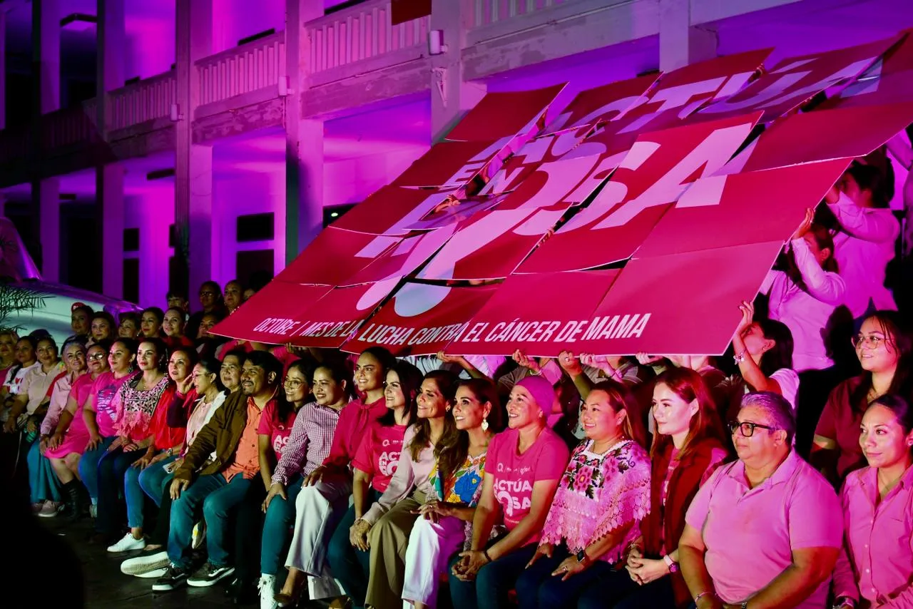 Chetumal.– En el marco del Mes de la Sensibilización sobre el Cáncer de Mama “Actúa en Rosa”, la gobernadora Mara Lezama Espinosa encabezó junto con la presidenta honoraria del Sistema DIF Estatal, Verónica Lezama Espinosa, el encendido de los edificios públicos y palacios municipales que durante octubre se iluminan de color rosa como símbolo de esperanza, solidaridad y prevención.