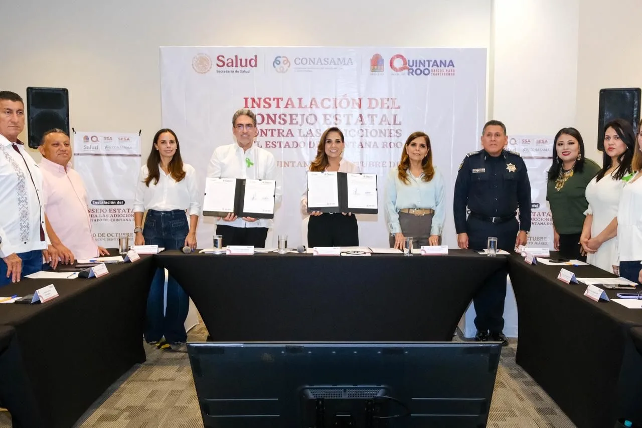 Los integrantes del Consejo Estatal contra las Adicciones son la gobernadora Mara Lezama; la presidenta honoraria del DIF Quintana Roo, Verónica Lezama Espinosa; el secretario de Seguridad Ciudadana, Julio César Gómez Torres; Mtra. Cecilia Isabel Bardales May; Ing. Jorge Isaías Quintanilla Osorio; Dip. Jennifer Paulina Rubio Tello; Dr. Enrique Leobardo Ureña Bogarín; Abril Cristina Sabido Alcérreca, directora general del DIF Quintana Roo; Psic. Liliam Negrete Estrella; Lic. Omega Istar Ponce Palomeque; Raciel López Salazar, Fiscal General; Flavio Carlos Rosado, secretario de Salud; y presidentas y presidentes municipales.
