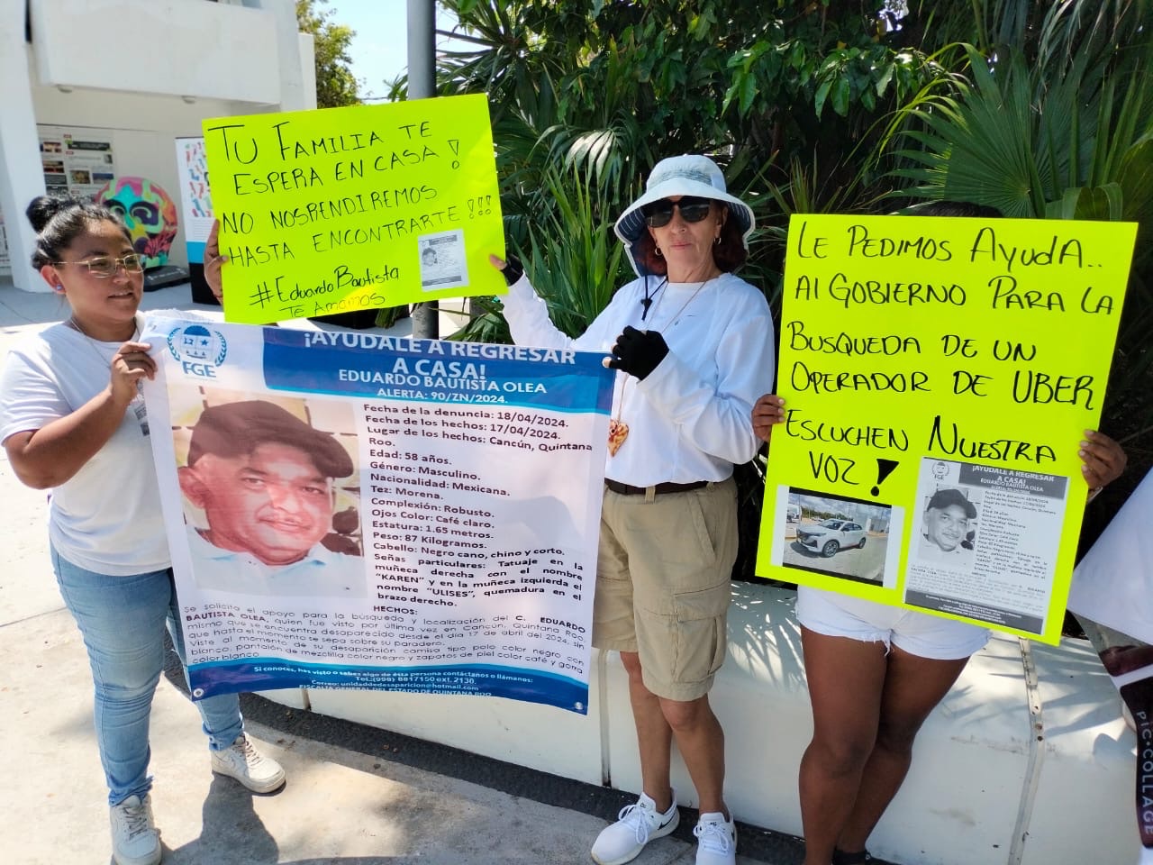 ZC/ Familiares de Eduardo Bautista Olea, conductor de la plataforma Uber que se encuentra desaparecido desde el pasado 17 de abril, se manifestaron esta mañana y recorrieron parte de la avenida Tulum hasta llegar frente al Palacio Municipal para pedir la ayuda de las autoridades para localizarlo.