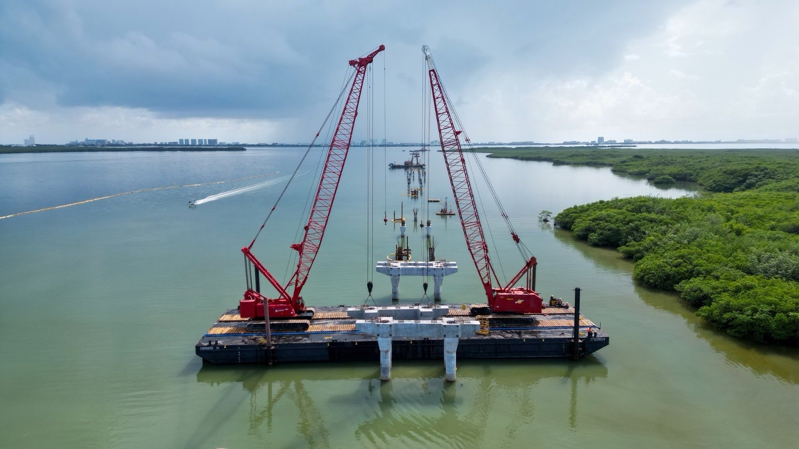 En la actualidad se han instalado 126 pilotes de los 226 que deben ser colocados sobre el Sistema Lagunar Nichupté, dando un avance de casi el 40 por ciento en obra.