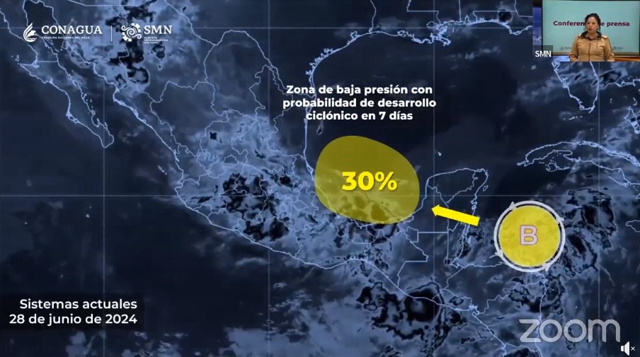 En una rueda de prensa efectuada por medio de videoconferencia a través de las redes sociales de la Comisión Nacional de Agua (Conagua), la coordinadora informa que el centro de la baja presión ingresará durante la tarde hoy al sur de la Península de Yucatán.