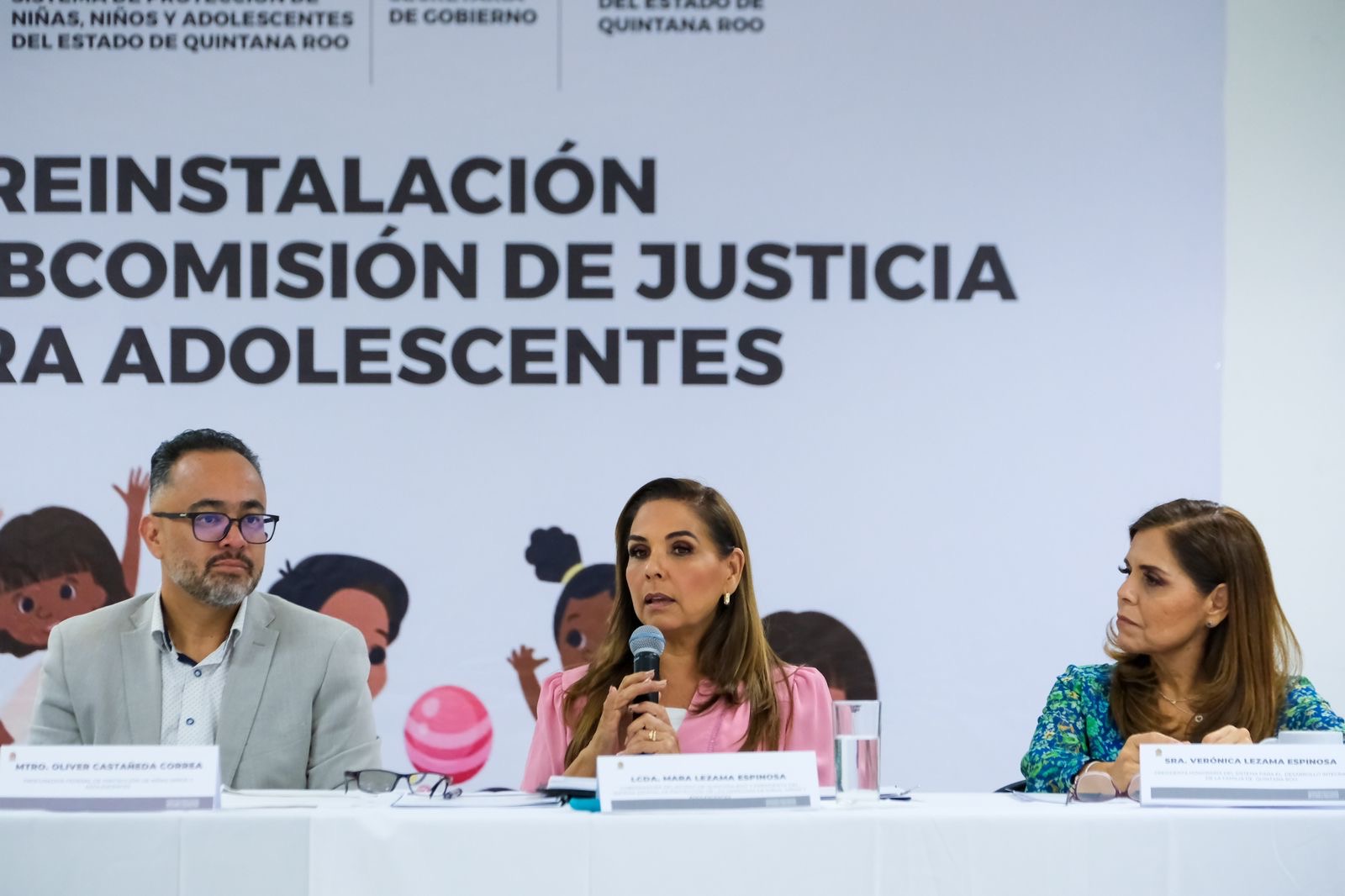 Cancún.- Con la presencia del Procurador Federal de Protección de Niñas, Niños y Adolescentes, Oliver Castañeda Correa, y de la Encargada de Despacho de la Secretaría Ejecutiva del Sistema Nacional de Protección de Niñas, Niños y Adolescentes (SIPINNA) María Constanza Tort San Román, la gobernadora Mara Lezama Espinosa participó en la reinstalación de la Subcomisión de Justicia para Adolescentes del Estado de Quintana Roo.