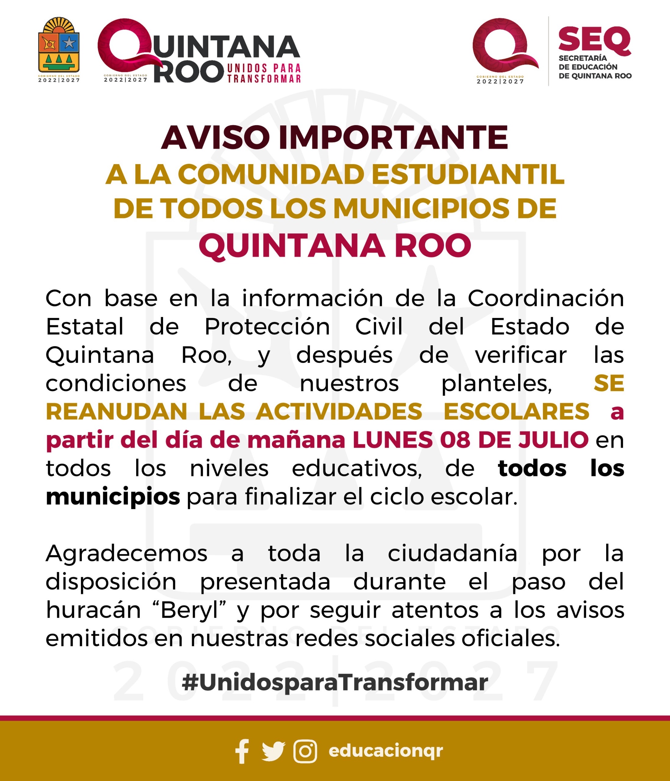 Chetumal.- Este lunes 8 de julio se reanudarán las actividades escolares en todos los niveles educativos de los 11 municipios del estado para finalizar el ciclo escolar, luego de haberse suspendido como medida preventiva por el paso del huracán “Beryl”, anunció la gobernadora Mara Lezama Espinosa.