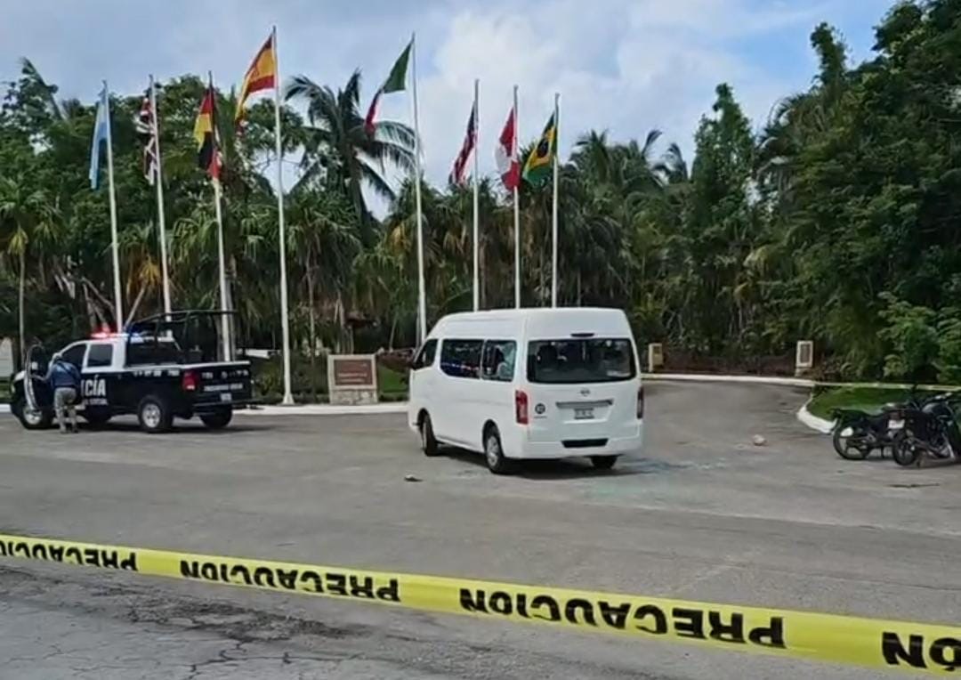 Cozumel, 24 de agosto 2024/ Esta mañana, taxistas del sindicato “Adolfo López Mateo” lanzaron piedras contra una van de transporte federal con un grupo de turistas a bordo, en la entrada del hotel Iberostar.