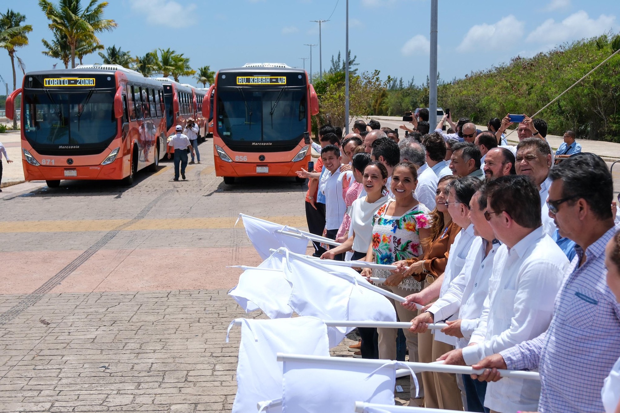 Empresarios concesionarios invitaron a la gobernadora Mara Lezama Espinosa y a la presidenta municipal de Benito Juárez, Ana Paty Peralta de la Peña, a la presentación de 100 nuevos autobuses, que completan una flota de 184 unidades, que se suman a mejorar el transporte público en Cancún.