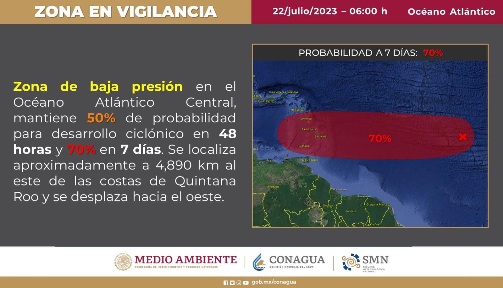 La gobernadora Mara Lezama informó que continúa la vigilancia de una zona de baja presión en el Océano Atlántico Central.